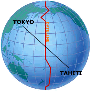 M.a.w. na middernacht begint de dag het eerst op dit punt, en gaat zo verder richting in westelijke richting (zon komt dus steeds op in het oosten!) via Japan, Azië, Rusland, Europa/Afrika, Amerika en uiteindelijk ook in Tahiti.