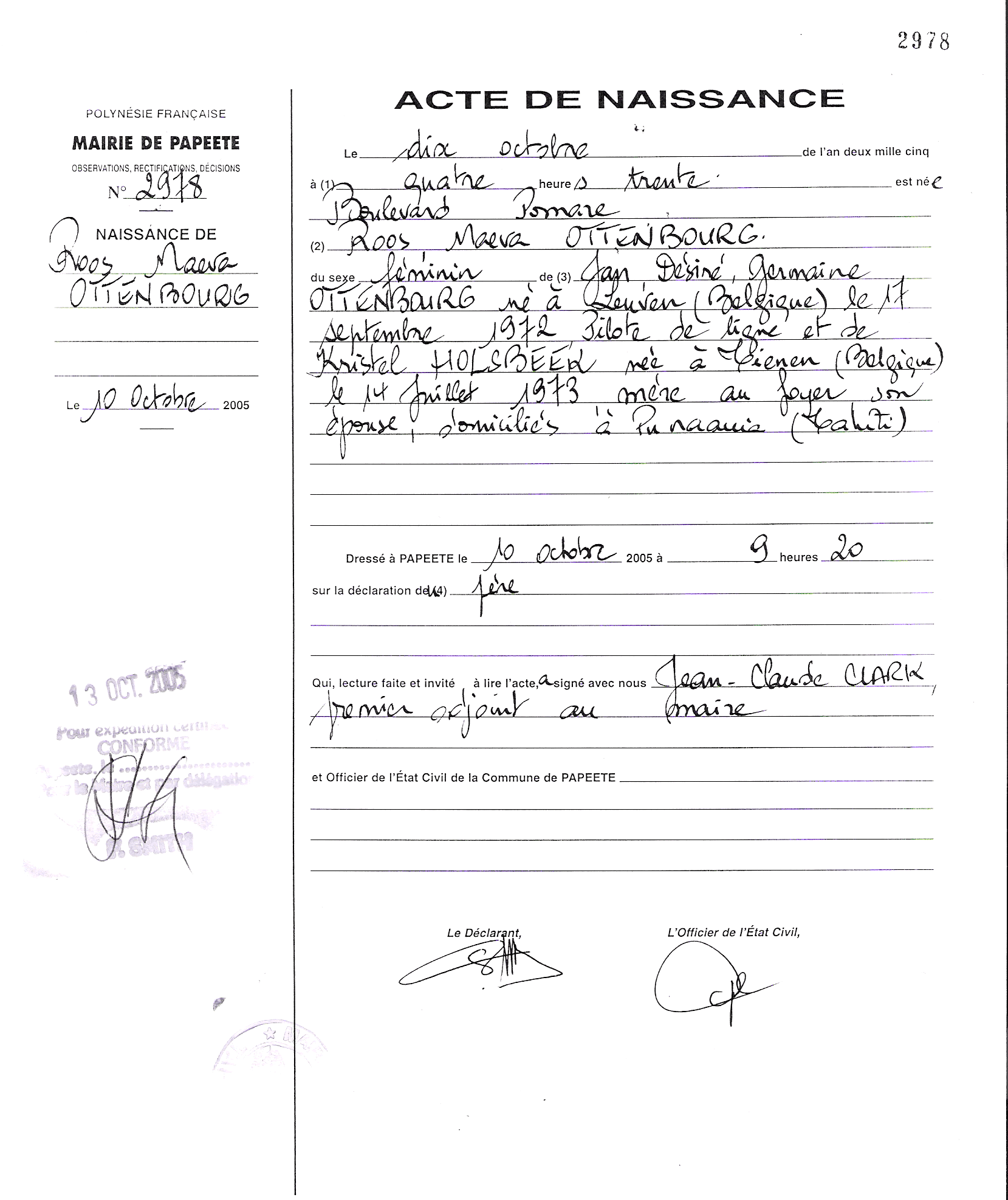 Drie dagen na de geboorte, ben ik op het stadhuis van Papeete, de geboorte van Roos gaan aangeven ("Declaration de Naissance") en heb er enkele officiële geboorteaktes ("Acte de Naissance") meegekregen (download hier).Zij staat er in het register ingeschreven onder het nummer 2978!