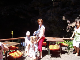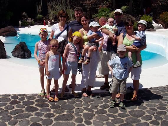 Hieronder, Jameos del Agua, lavagrotten omgebouwd tot een toeristisch complex door de kunstenaar en het standbeeld van de boer.