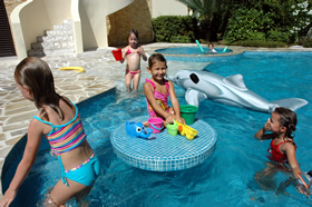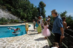 Negen leeftijdsgenootjes (voornamelijk uit haar klas, vroegere school en/of kinderen van collega's) daagden rond 13u30 op aan ons zwembad, dat voor de gelegenheid speciaal werd voorzien van allerhande water-speeltjes.