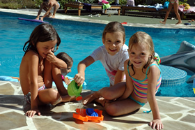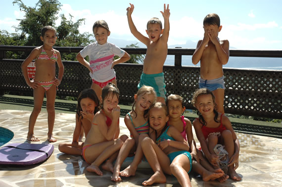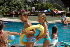 Gelukkig kon iedereen goed zwemmen en er heerste dan ook al snel een uitgelaten sfeer. Vooral de waterpistools en de plastiek emmertjes waren gegeerde objecten... maar de (twee) jongens verweerden zich dapper tussen al dat vrouwelijke geweld ;-)
