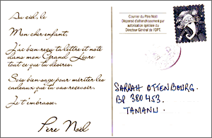 Na haar briefje dat Sara geschreven had aan de Kerstman en dat we samen op de post gedaan hebben, lag er bij onze thuiskomst van België een kaartje van de Kerstman in onze brievenbus (welliswaar aan Sarrah Ottenbourg).Mon cher enfant,