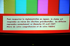Pour respecter la réglementation en vigeur, la chaine est suspendue en raison des élections présidentielles. Sa diffusion reprendra normalement ce dimanche 22 avril 2007.