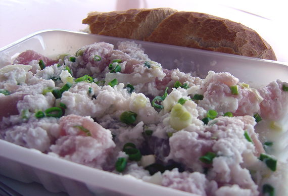 Een typisch Tahitiaans ontbijt bestaande uit rauwe vis (rode tonijn) in een kokosnoot-sausje met wat ajuin en stokbrood: "Poisson Cru à la Coco". Smulsmul...