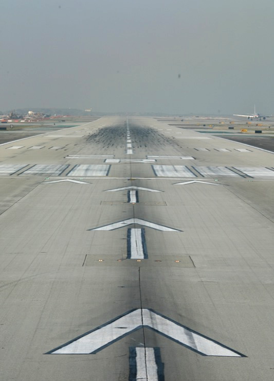 Opstijgen gebeurt op startbaan RWY 25R, richting oceaan.