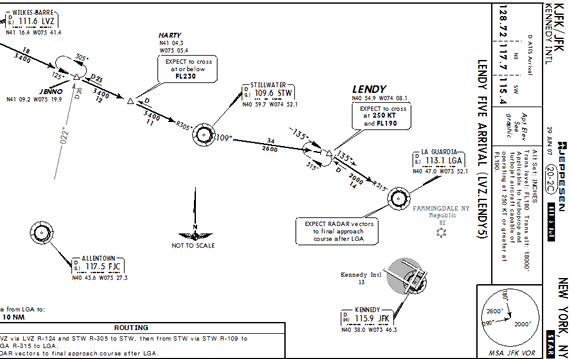 De nadering in New York vanuit het westen wordt ingezet via een LENDY 5 'Standard Terminal Arrival Route' (STAR).