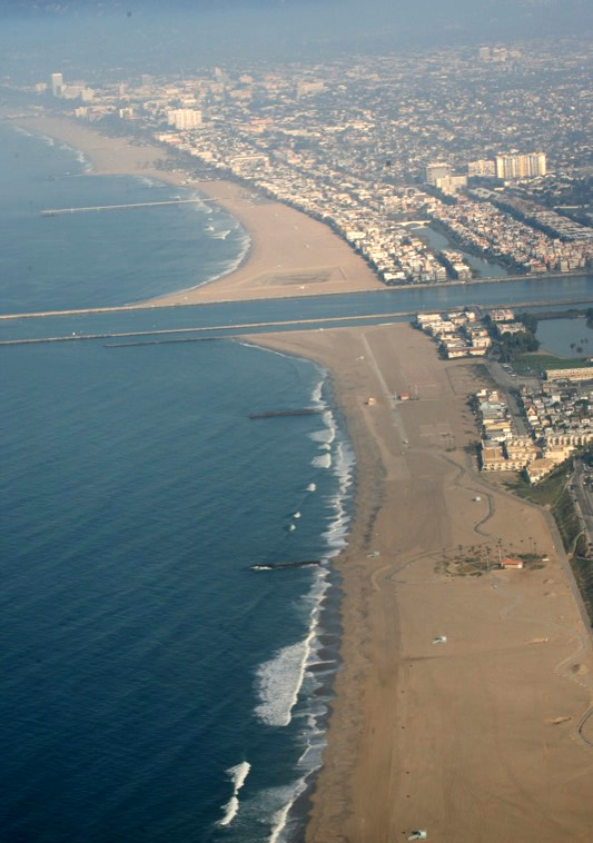We zijn "vederlicht" (amper 185.000kg) waardoor we al vrij hoog over de kust (Marina Del Rey, Venice Beach en Santa Monica Beach) vliegen.