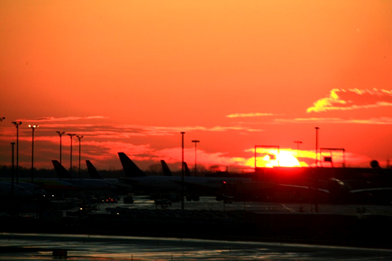 Tijdens een mooi zonsondergang komen we uiteindelijk toe op onze parking (67) in Terminal 4.