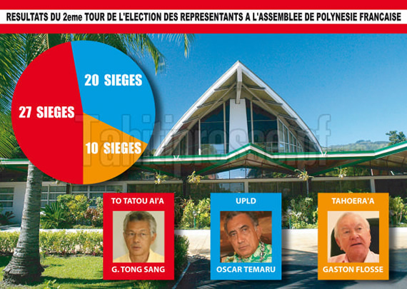 - 27 zetels (op 57) voor de nieuwe partij To Tatou Ai'a (Ma patrie) van Gaston Tong Sang (GTS)