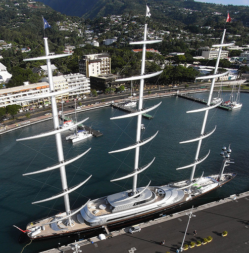 De luxe zeilboot "Maltese Falcon" ligt nog steeds in de haven van Papeete.