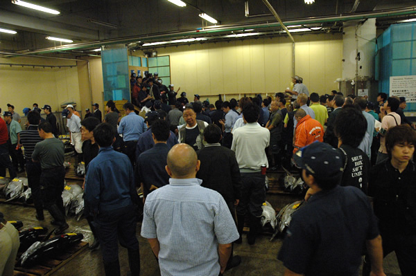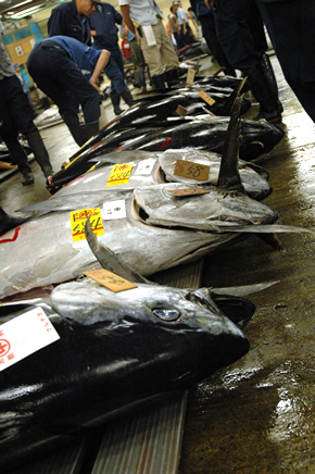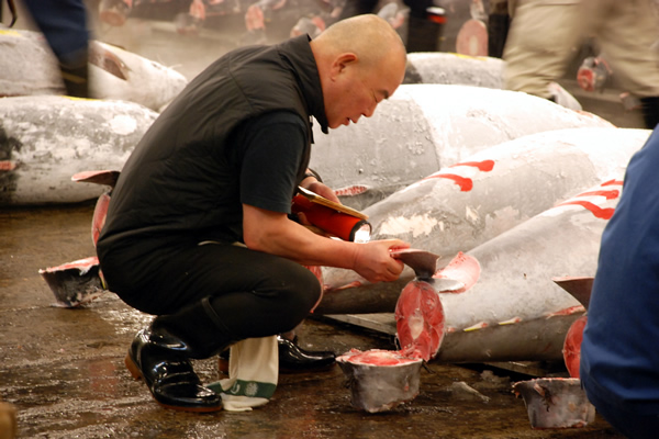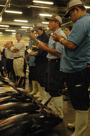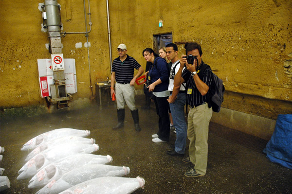 Onze rondleiding startte bij de enorme, diepgevroren tonijnen (aan -70°C!) die werden klaargemaakt en genummerd om te verkopen en vervolgens grondig werden nagekeken door verkopers en potentiële kopers/bieders.