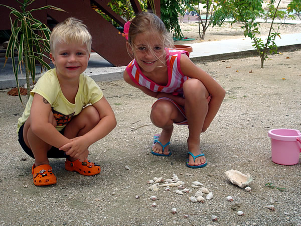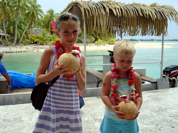 ... en dan met een bootje naar het pension, waar we werden opgewacht met een lokaal drankje.