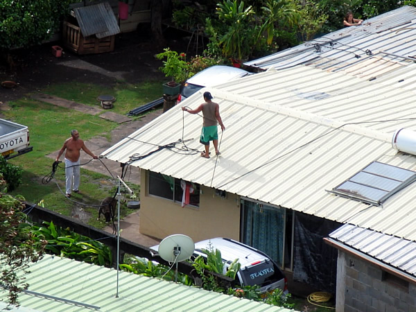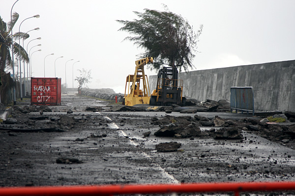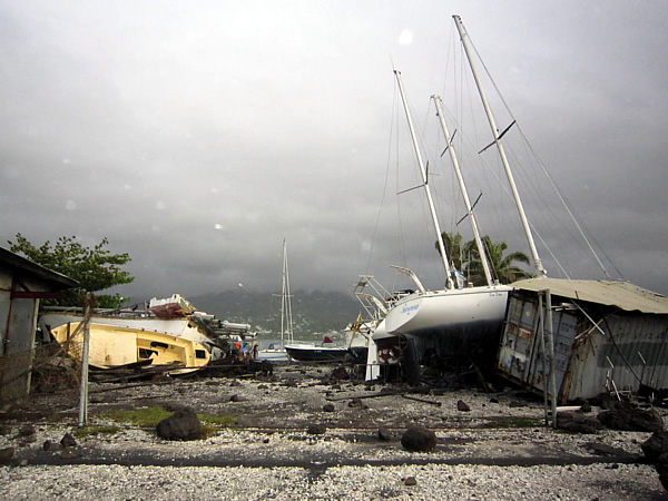 Maar... we zijn erdoor geraakt!! Gelukkig hebben de kinderen relatief goed geslapen ondanks het weer. De wind blijft weliswaar sterk en er wordt aangeraden om binnen te blijven. Rond de middag wordt de alarmfase opgeheven en dan wordt het duidelijk dat er toch wel heel wat materiële schade is. Vooral huizen aan het water, de jachthavens en de zeehaven van Papeete hebben het zwaar te verduren gekregen.