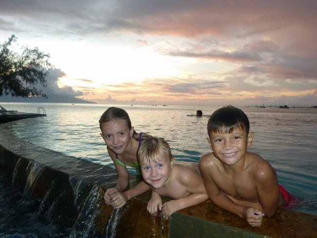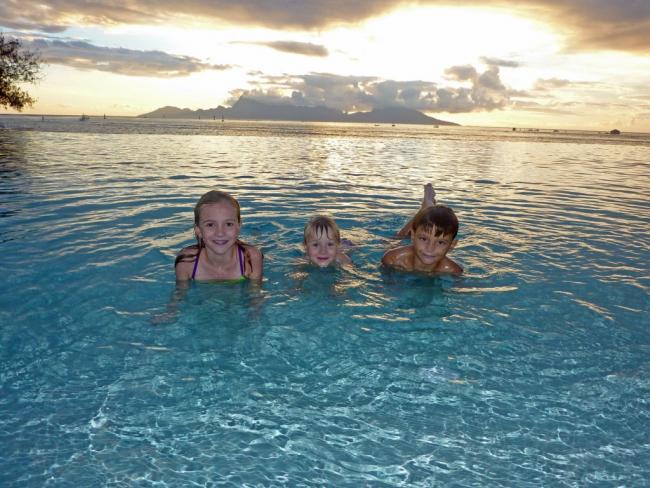 De kinderen konden (met Maxime) deze namiddag hun hart ophalen aan het zwembad van het Manava Suite Resort, op 5 minuten van bij ons.