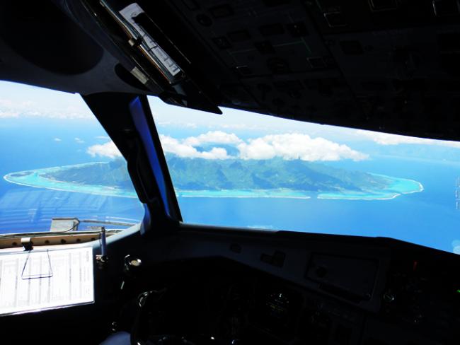 Dag 3 was het dan 's morgens afscheid nemen van Alain & Any Grandpierre en met het ATR-vliegtuig van Air Tahiti via Moorea (zie foto) terug naar Tahiti.