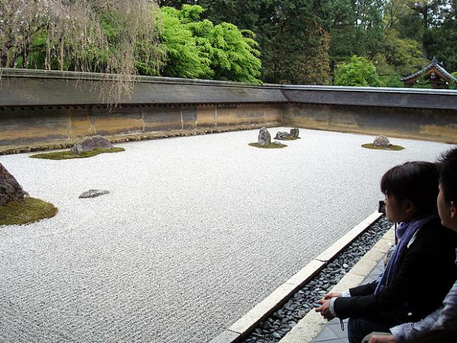 Een Japanse tuin met gegritselde kiezels en 15 uitstekende rotsen.