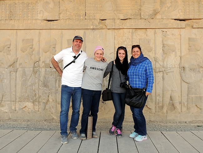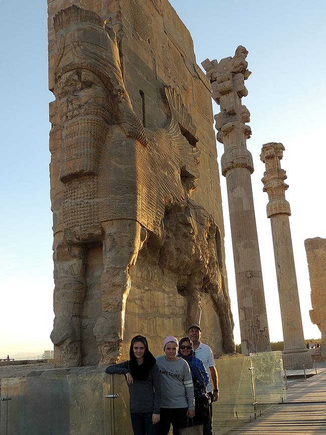 Familie foto aan de bekende "Poort van alle Naties", die wordt bewaakt door reusachtige gevleugelde stieren met mensenhoofden. Fantastisch!! Zoals in de geschiedenisboeken...
